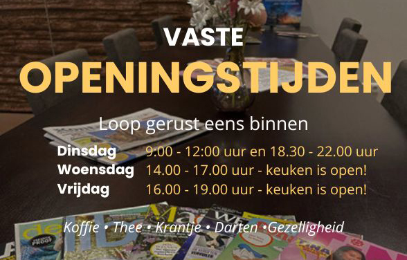 Elke dinsdag van 18.30 – 20.00 uur.